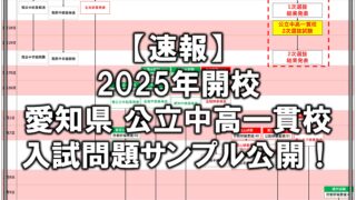 未分類【速報】明和中の入試問題サンプルが公表されました!(愛知県 公立中高一貫校の入試問題サンプルの公表) 2025年実施予定の、愛知県公立中高一貫校の入試問題サンプルが発表されたので、概要をまとめました。 2023.12.26未分類中学受験/高校受験公立中高一貫校