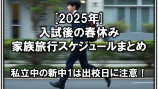 中学受験/高校受験[2025年]入試後の春休み家族旅行スケジュールについて-私立中の出校日に注意!- 2025年の中学受験や高校受験、卒業式のスケジュールをまとめ、春休みの家族旅行に行くタイミングを考察しています。 2024.11.28中学受験/高校受験公立中高一貫校中高一貫校