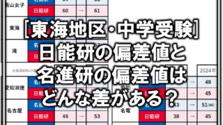中学受験/高校受験[中学受験]日能研偏差値と名進研偏差値の比較 さて、中学受験で"偏差値"という言葉をよく聞きますが、データの取り方でその数字が大きく変わるというのはご存知でしょうか。 例えば、中部地区の場合 「日能研偏差値」 「名進研偏差値」 の2つの偏差値を目にする方が多いのではないかと... 2024.11.15中学受験/高校受験中高一貫校