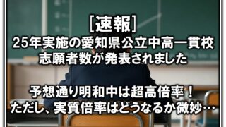 中学受験/高校受験[速報]25年明和中入試の志願者数・倍率が発表されました 25年の愛知県公立中高一貫校の志願者数が発表されたので、単純倍率を算出し、昨年の私立中倍率と比較しました。 2024.12.10中学受験/高校受験公立中高一貫校中高一貫校
