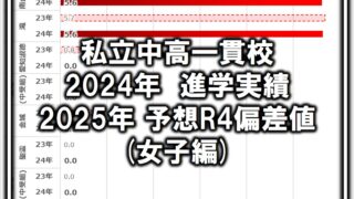 中学受験/高校受験[2024年データ]中高一貫私立校の進学実績とR4偏差値(女子編) 2024年の中高一貫私立校における大学合格実績と2025年の予測R4偏差値をまとめました。 やはり滝と南山女子が圧倒的ですが、南山女子が若干不調気味でした。 2024.07.04中学受験/高校受験中高一貫校