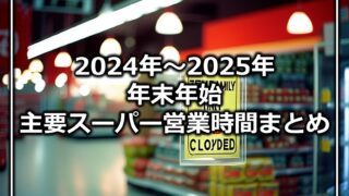 その他名古屋のお話年末年始の主要スーパーの営業状況まとめ(2024年から2025年) 2024年から2025年にかけて、名古屋市の主要スーパー(西友、マックスバリュ、バロー、アオキスーパー、ヤマナカ、フランテ、フィール、コノミヤ)が年末年始にどのような営業状況であるかまとめました。 西友とマックスバリュが通常営業を維持しているので生活に困ることはなさそうです。 2024.12.25その他名古屋のお話