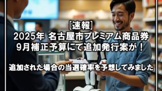 その他名古屋のお話[速報]25年名古屋市プレミアム商品券の予算増が9月補正予算に入りました 25年の名古屋市プレミアム商品券について、9月補正予算で追加発行案が出たので、通った場合の当選確率イメージを算出してみました。 2025.09.05その他名古屋のお話子育てプレミアム商品券プレミアム商品券申込状況速報