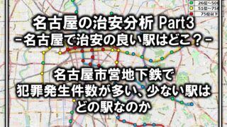 その他名古屋のお話名古屋の治安分析 Part3 -名古屋で治安の良い駅はどこ?- 愛知県警の犯罪オープンデータから名古屋市営地下鉄各駅の犯罪発生件数のランキング化を行いました。 2024.05.31その他名古屋のお話名古屋市営地下鉄学区紹介
