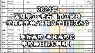 中学受験/高校受験[2024年]名古屋の私立中説明会・体験授業・文化祭の予定(共学校編+まとめ) 2024年における名古屋の私立中学共学校(滝中学、愛知中学、愛工大名電中、春日丘中)の説明会、体験授業、オープンキャンパス、オープンスクール、文化祭の日程情報をまとめました。 2024.05.21中学受験/高校受験中高一貫校