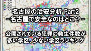 その他名古屋のお話名古屋の治安分析 Part3 -名古屋で治安の良い駅はどこ?- 愛知県警の犯罪オープンデータから名古屋市営地下鉄各駅の犯罪発生件数のランキング化を行いました。 2024.05.31その他名古屋のお話名古屋市営地下鉄学区紹介
