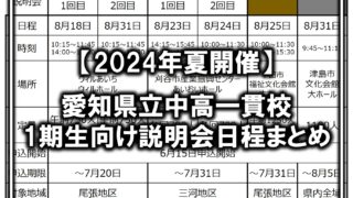 中学受験/高校受験[速報]2024年夏の愛知県公立中高一貫校の説明会日程が発表されました 2025年4月開校予定の明和中・刈谷中・半田中・津島中の説明会が2024年8月に開催される事が発表されたので、日程等についてまとめました。 2024.06.12中学受験/高校受験公立中高一貫校