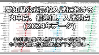 中学受験/高校受験[2024年データ]愛知県の公立高校受験の内申点や入試得点、偏差値まとめ 愛知県の公立高校入試における上位校の内申点、偏差値、入学試験における得点についてまとめました。 昨年の難易度大幅低下の反動が明確に出る結果でした。 2024.08.29中学受験/高校受験