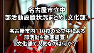 学区紹介名古屋市立中学校の部活動まとめ(文化部) 名古屋市内の公立中110校に設置されている部活動を調査し、人気の部活動は何かをランキング化しました。 各競技が部活動として採用されている学校リストも付記してあります。 2024.12.19学区紹介