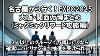 名古屋近郊の遊び場名古屋から行く!EXPO2025 大阪・関西万博まとめ(ミャクミャクリワード攻略編) 大阪万博について、ミャクミャクリワードを活用したパビリオンの追加抽選についてまとめました。 2025.05.23名古屋近郊の遊び場