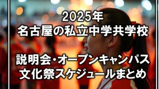 中学受験/高校受験[2025年]名古屋の私立中説明会・体験授業・文化祭の予定(共学校編+まとめ) 2025年における名古屋の私立中学共学校(滝中学、愛知中学、愛工大名電中、春日丘中)の説明会、体験授業、オープンキャンパス、オープンスクール、文化祭の日程情報をまとめました。 2025.05.26中学受験/高校受験