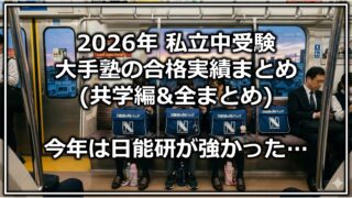 中学受験/高校受験[2026年]大手中学受験塾の合格実績推移(共学校編+まとめ) 東海地区の中学受験塾の大手である、名進研、日能研、浜学園、馬渕教室の合格実績について、2013年から2026年までの推移をまとめました。 今回は共学校編で、滝中学、愛知中、名電中、名古屋葵の結果で、これまでの男子校、女子校の結果も含めたまとめも掲載しています。 2026.03.05中学受験/高校受験中高一貫校