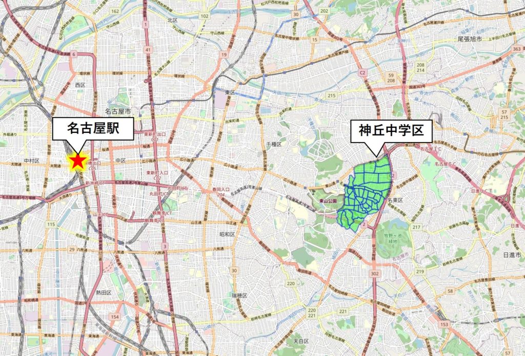 まずは具体的に名古屋のどこが神丘中の通学可能範囲なのかご紹介します。