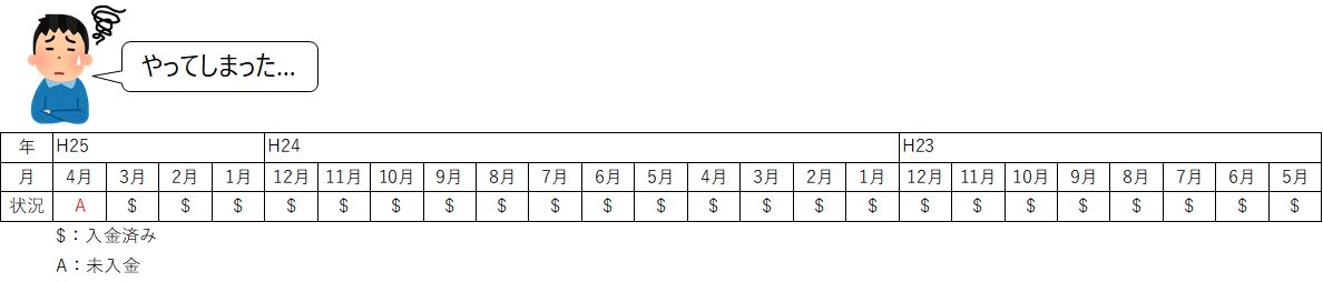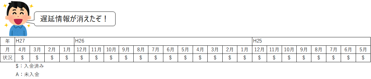 この記録はその借金ごとに、24ヶ月分の支払い状況の記録が残ります。うっかり支払いを遅延すると、その月の支払いが遅れた、というデータが残るわけです。