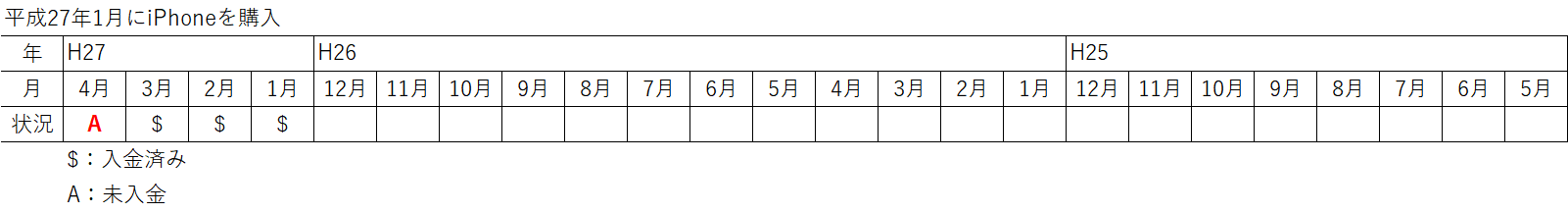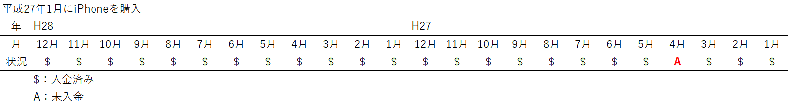 例えば、平成27年1月に新しいスマホを割賦で購入し、平成27年4月に滞納した場合