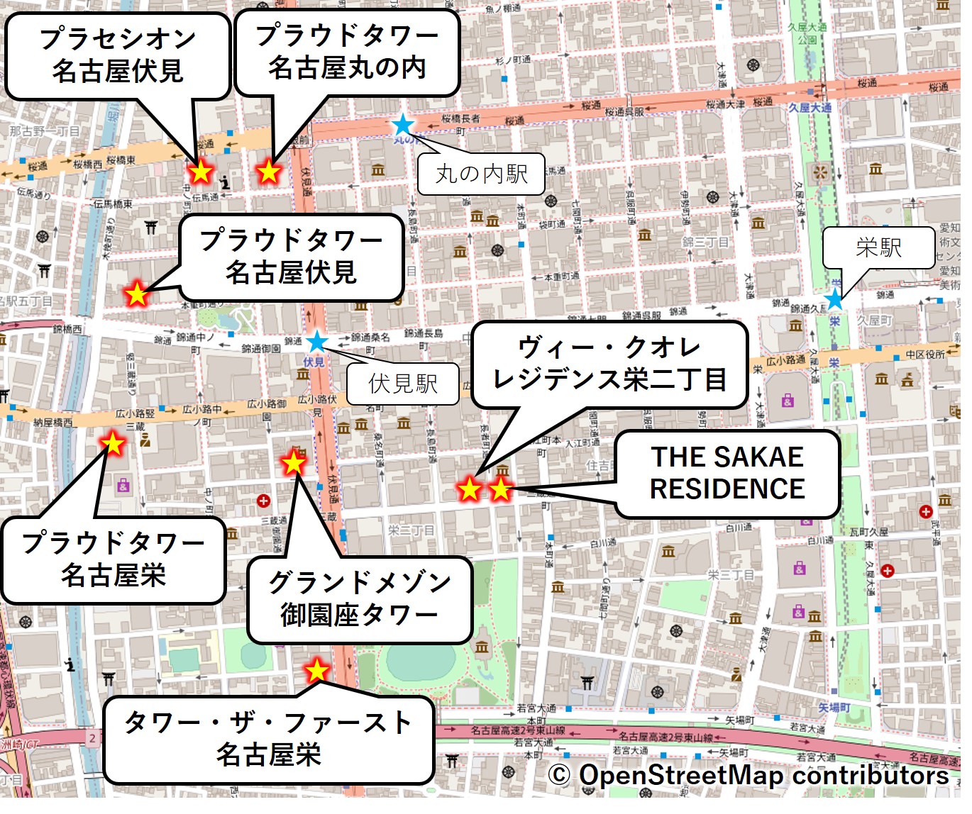 先日アップした新築の調査でも出てきたプラウドタワー名古屋錦も入れると、この狭いエリアで4件のタワー物件があることになります。