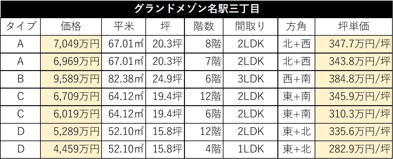 以前調査した名駅周辺の相場観と照らし合わせも、最も近いシティハウス名駅那古野が270万円/坪程度であるため、やはり割高であることは否めません。