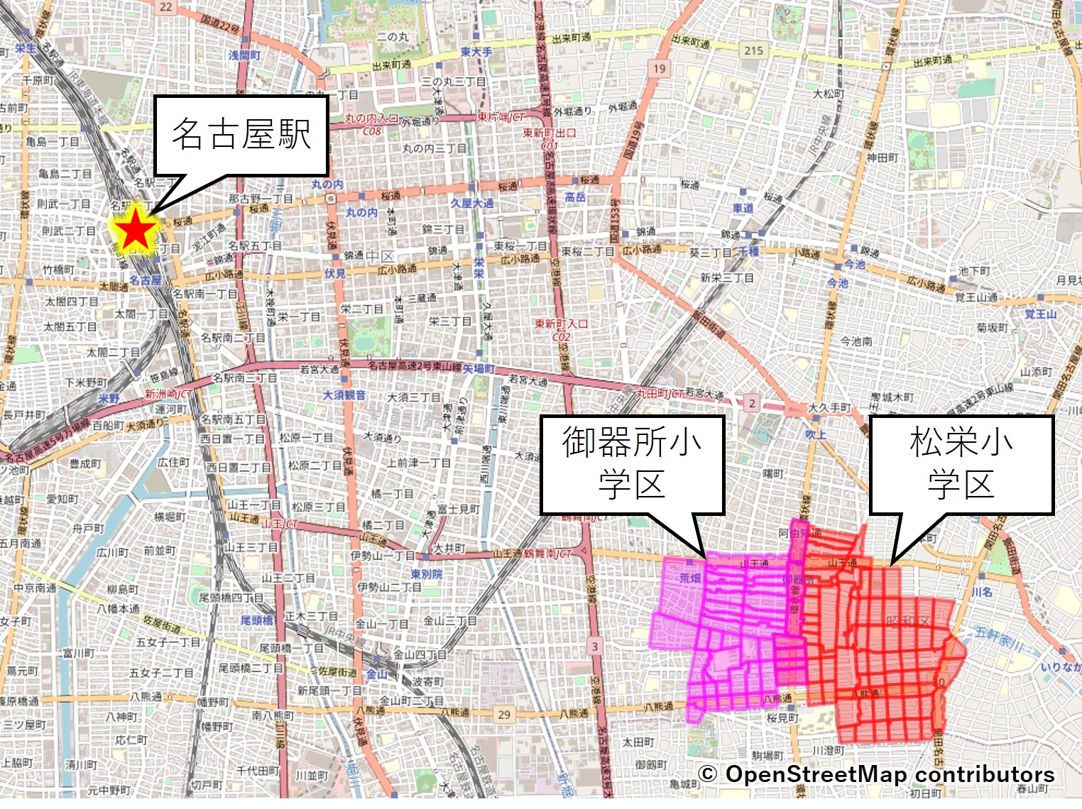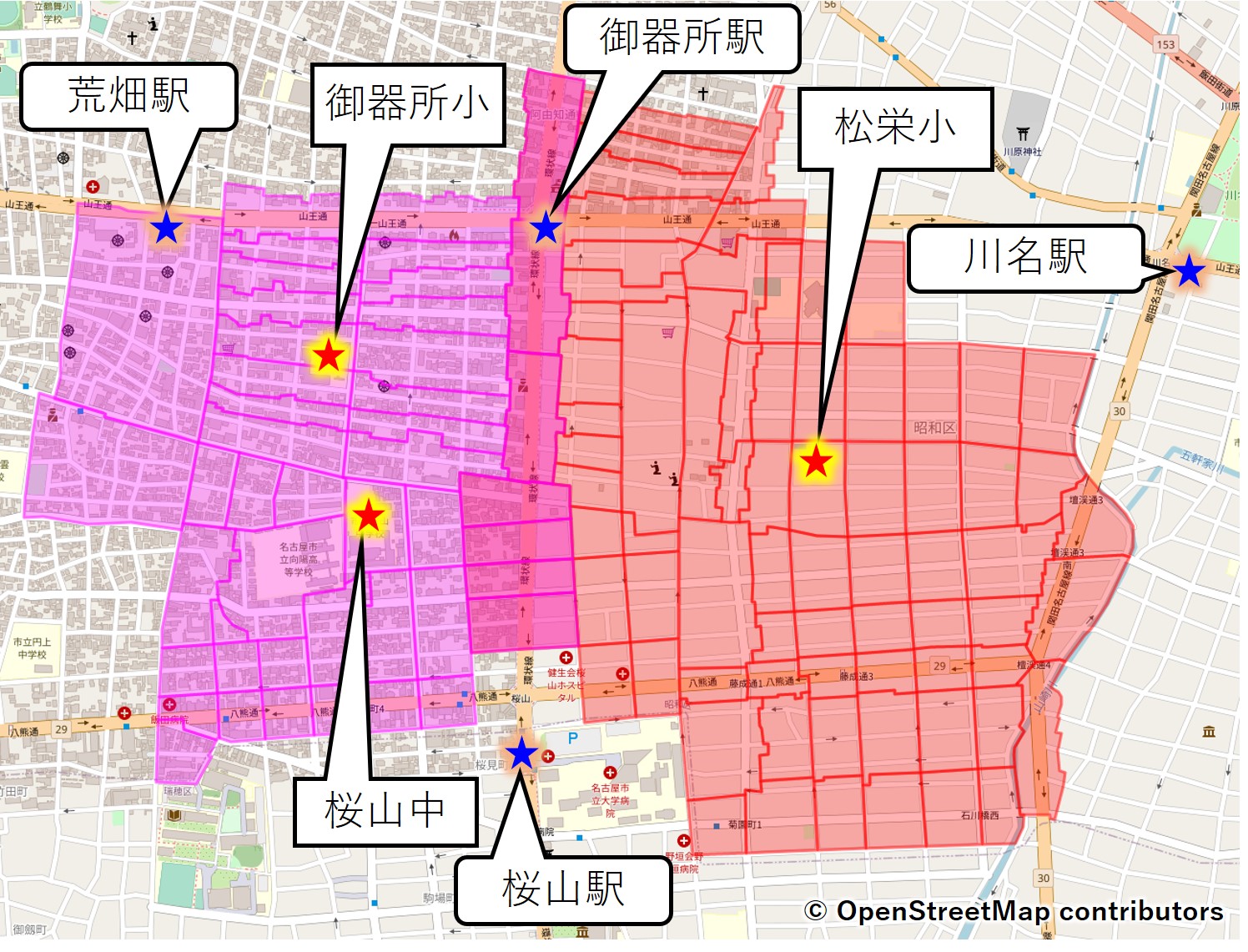 マップ中央部より西のピンク色エリアが御器所小
