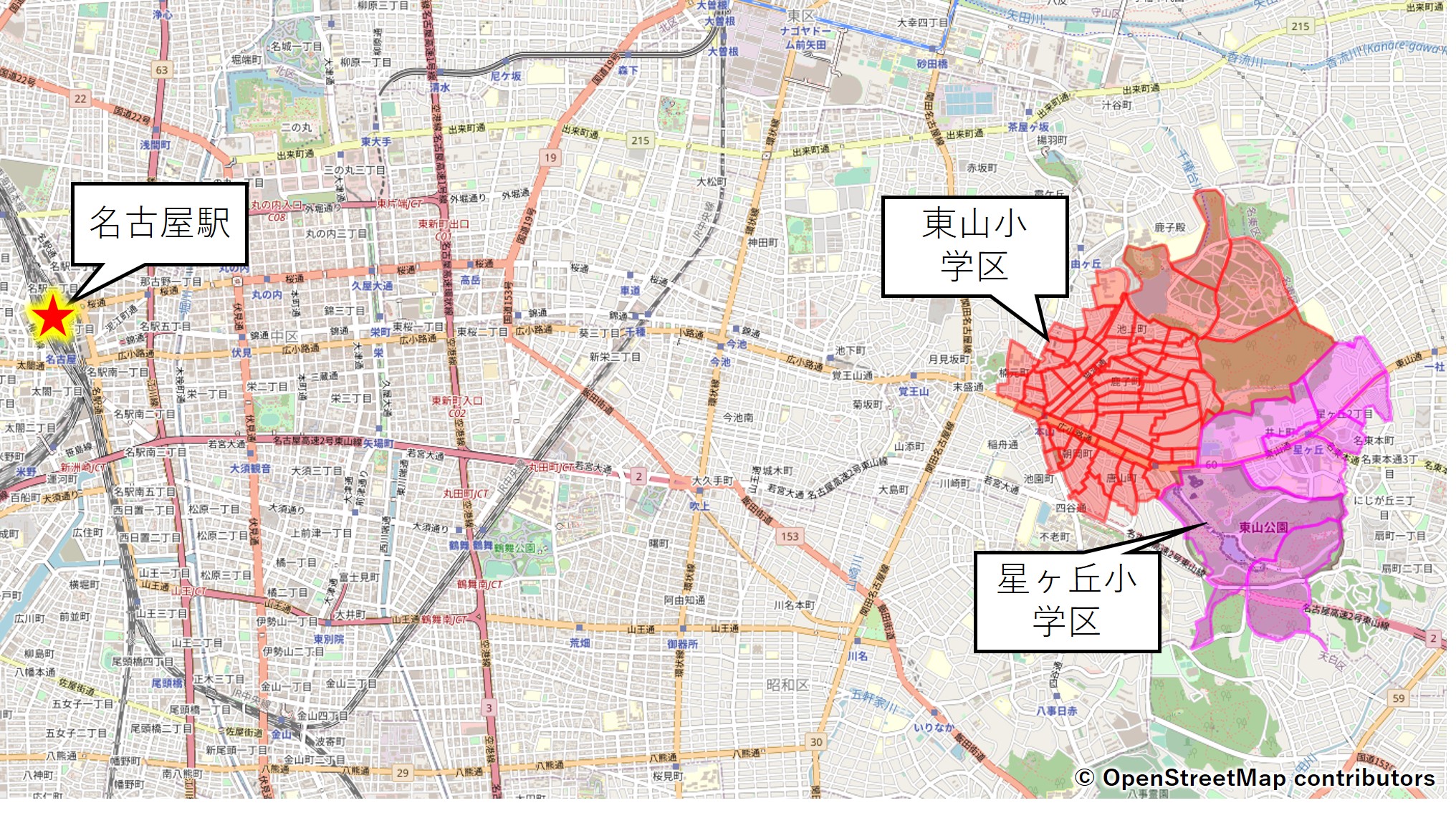 東山小学区の場合、名駅に行く場合は本山駅または東山公園駅から行くことになります。