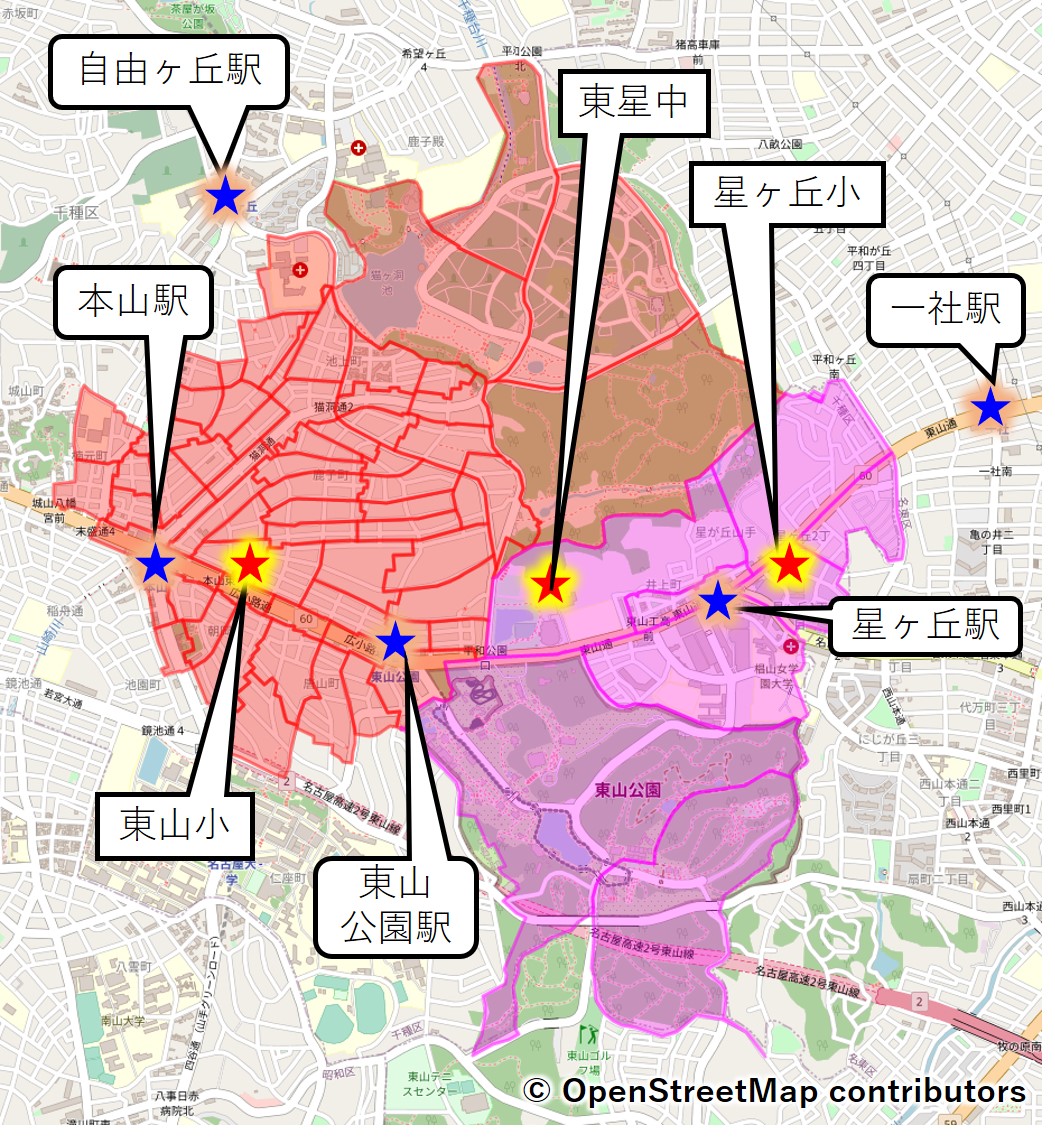 星ヶ丘小学区は、マップを一見しただけだと南側が非常に駅まで遠い場所であるように見えますが、実は東山公園の敷地がほとんどで、住宅が皆無ではないですが、住む場所は少ないです。