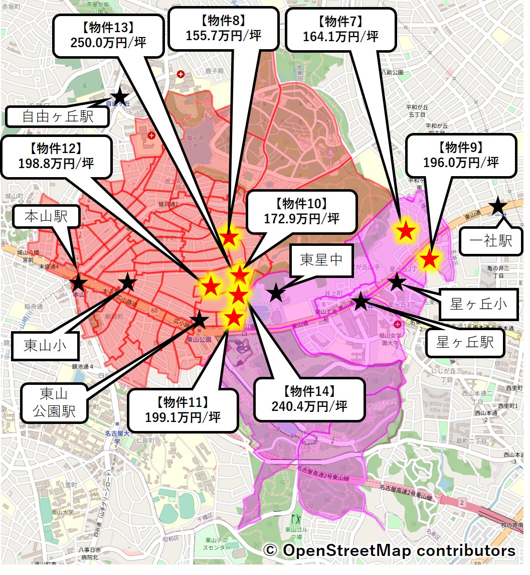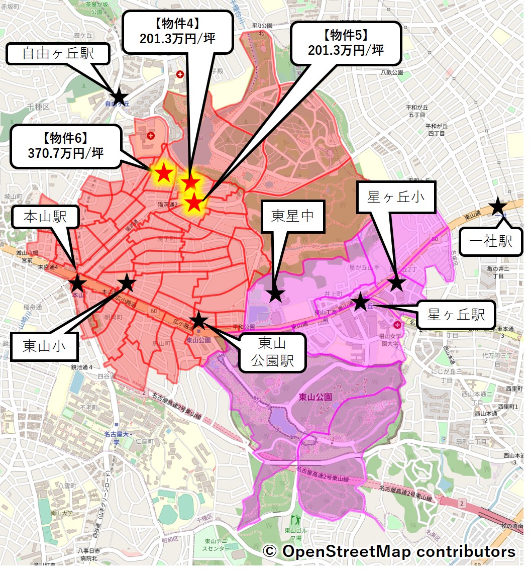 ただ、今回ヒットしたのは全て東山小学区であり、さらに人気のある本山エリアのため若干高めに出ている可能性があるのに注意が必要です。