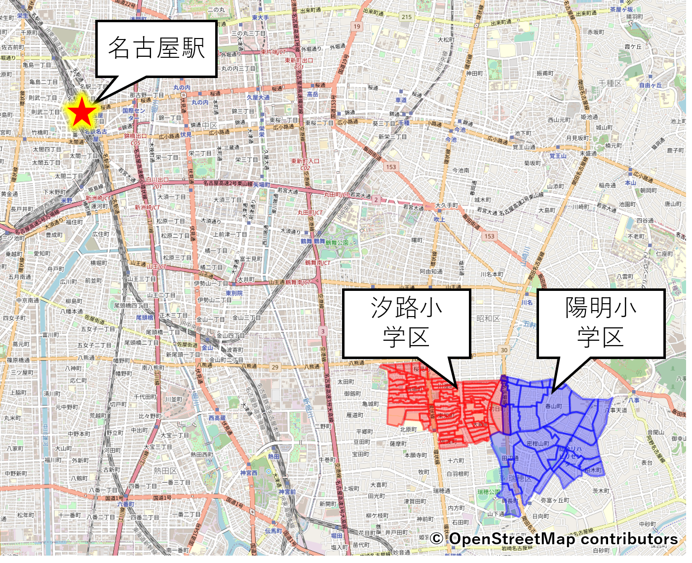 あまり意味がないかもしれませんが、各小学校から名古屋駅までのアクセスを調べてみました。