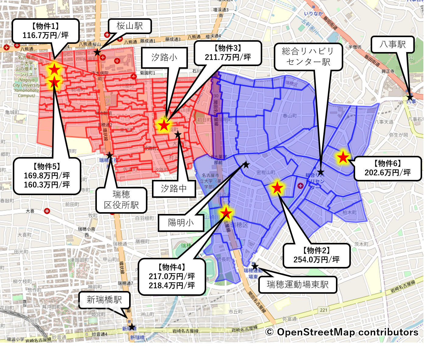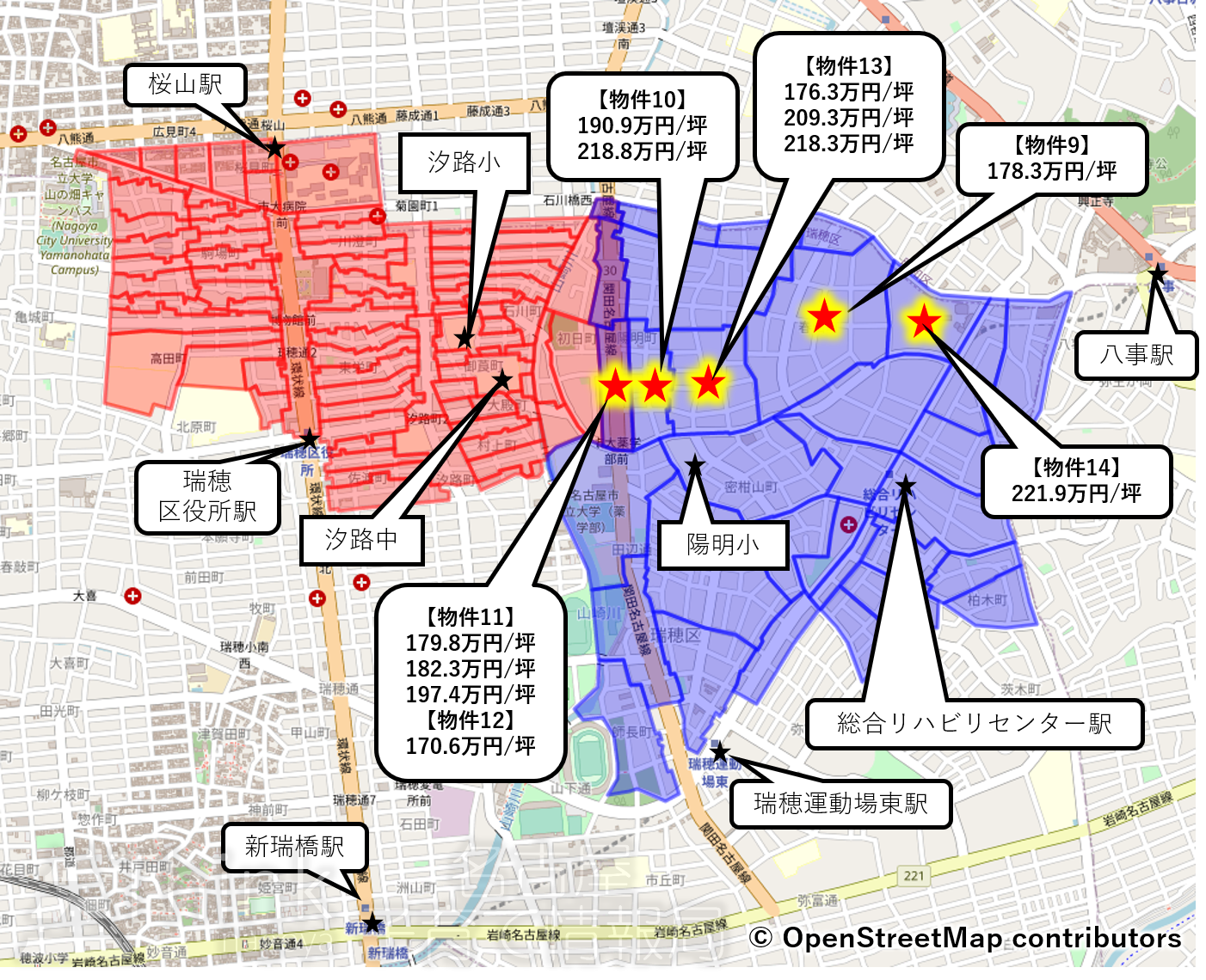 - 瑞穂区役所駅-桜山駅のラインより西側は比較的お値打ちな設定で170万円/坪以下