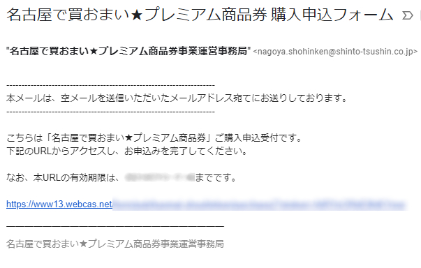 前の手順で応募完了画面が出た場合、最初に空メールを送ったアドレスに以下のメールが来ています。