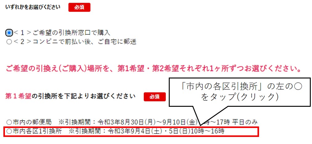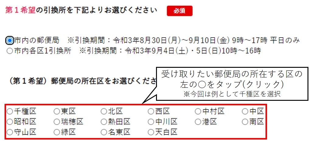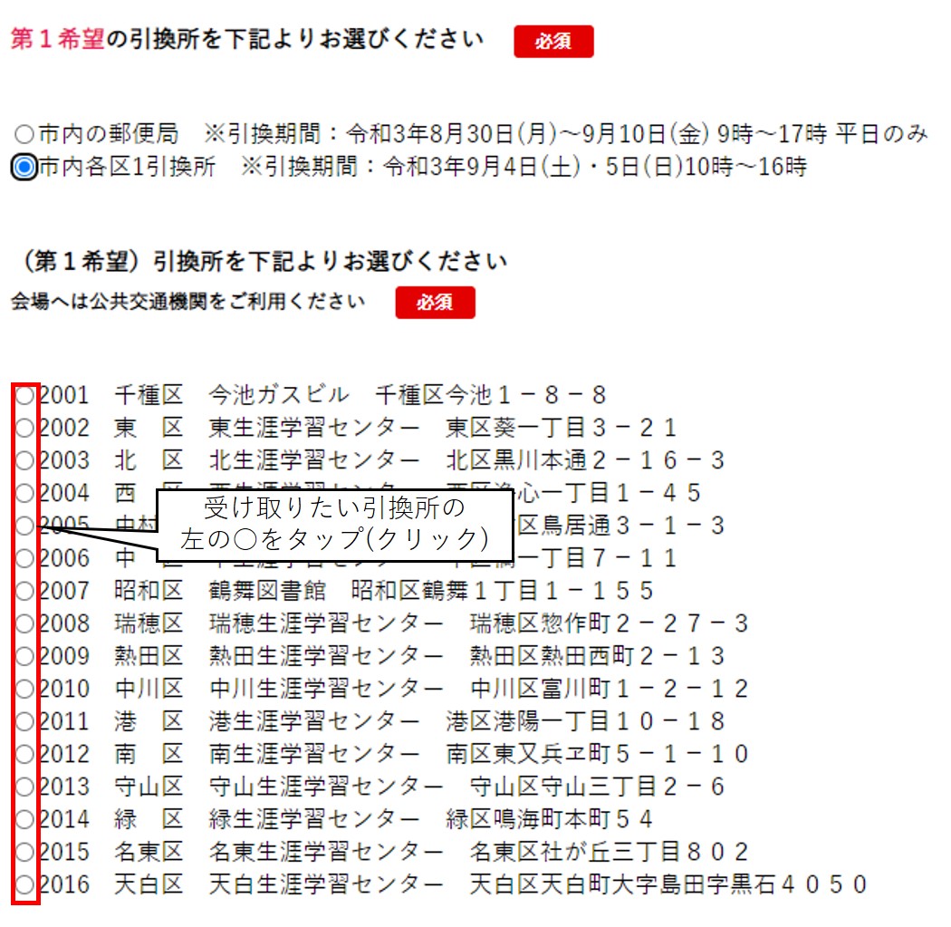 区を選択すると、各区の引換所リストが出るので、希望する場所を選択します。