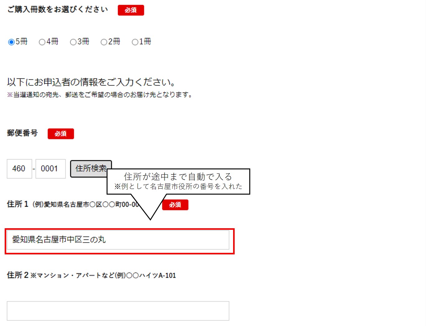 正しい郵便番号が入力されていれば、住所が途中まで自動的に入ります。