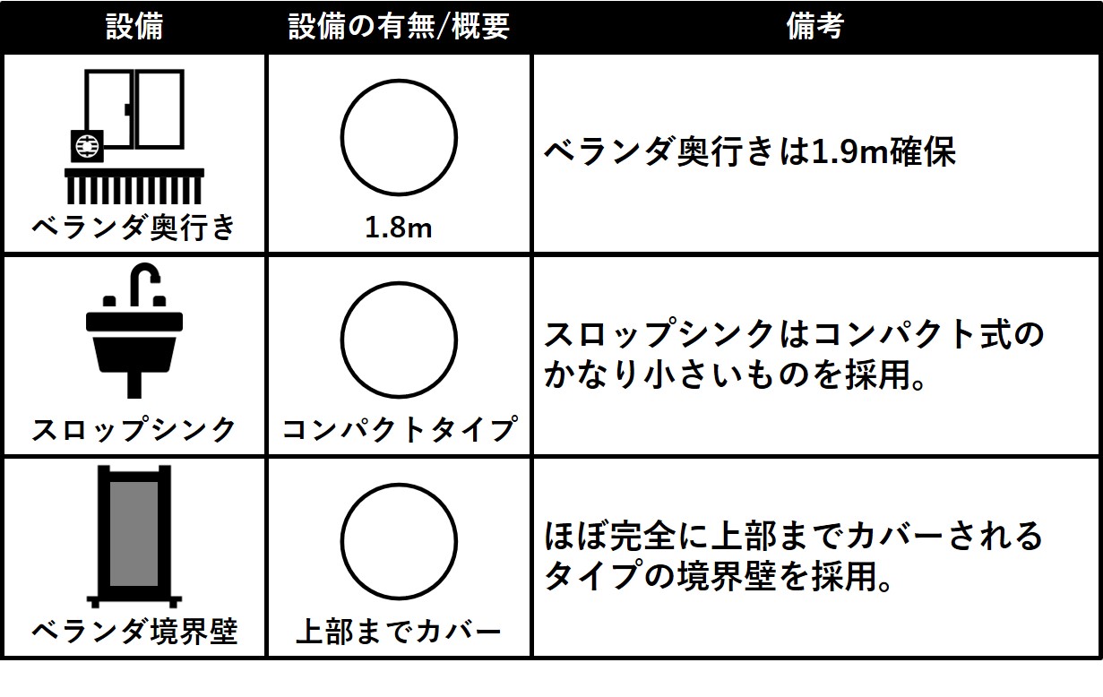 ベランダ関係の仕様は以下のようになっています。