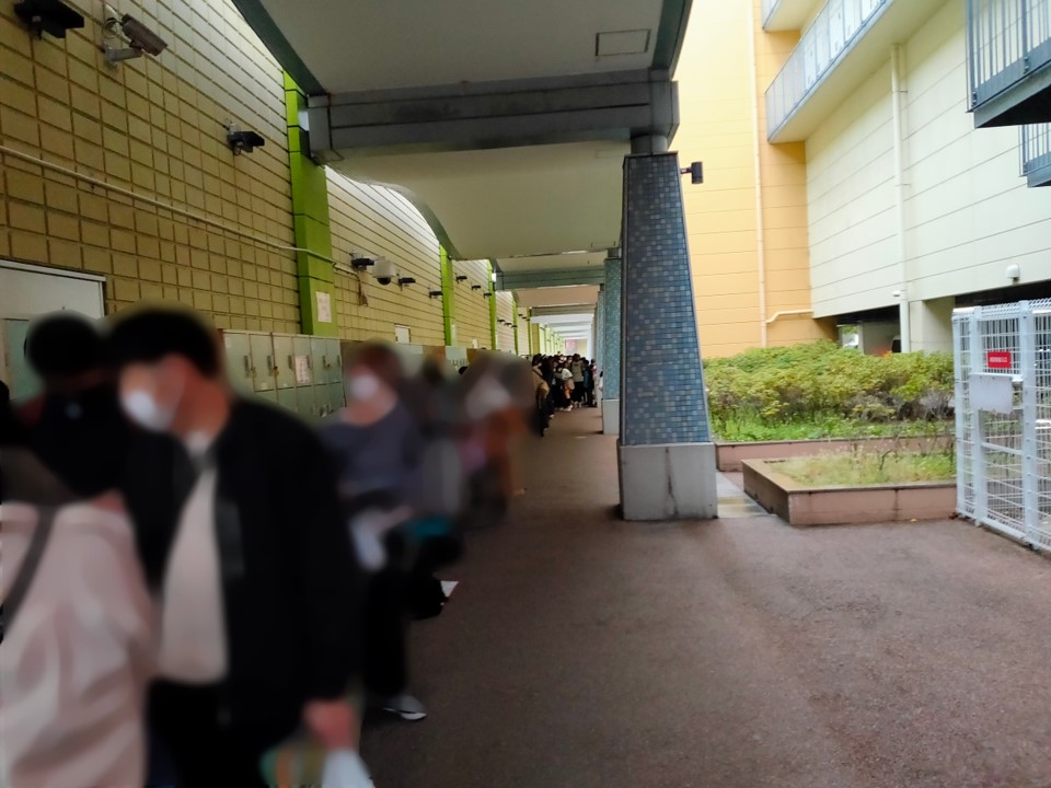 なお、私が行った際は雨だったため、上記写真の通り、エスカレーター横の屋根がある場所がいっぱいになると、一旦待機列を途切れさせて、駐車場横の屋根がある場所から再度待機列を再形成するようです。