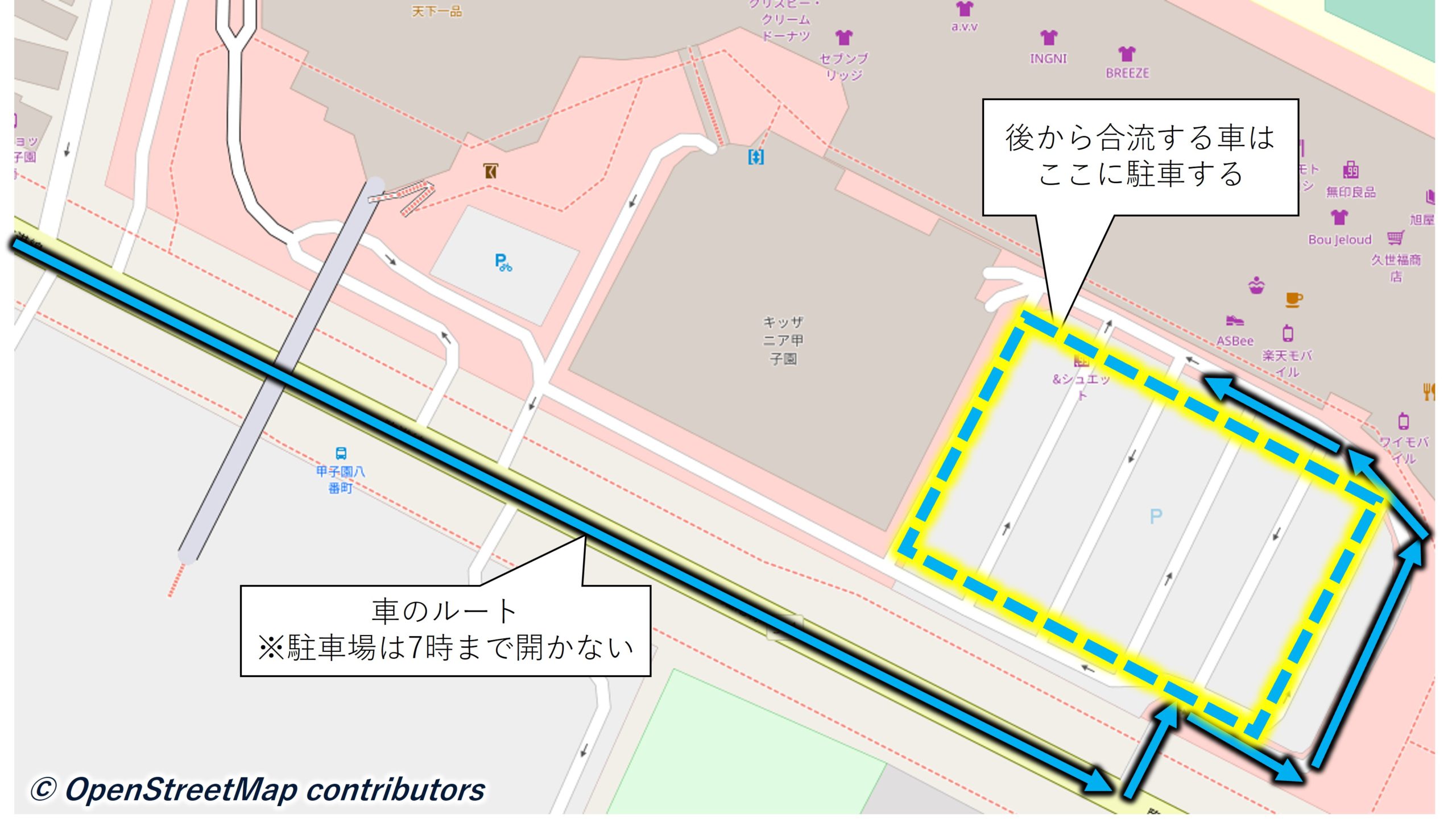 なお、駐車場の場所は以下の通りで、待機列の場所からかなり近いです。