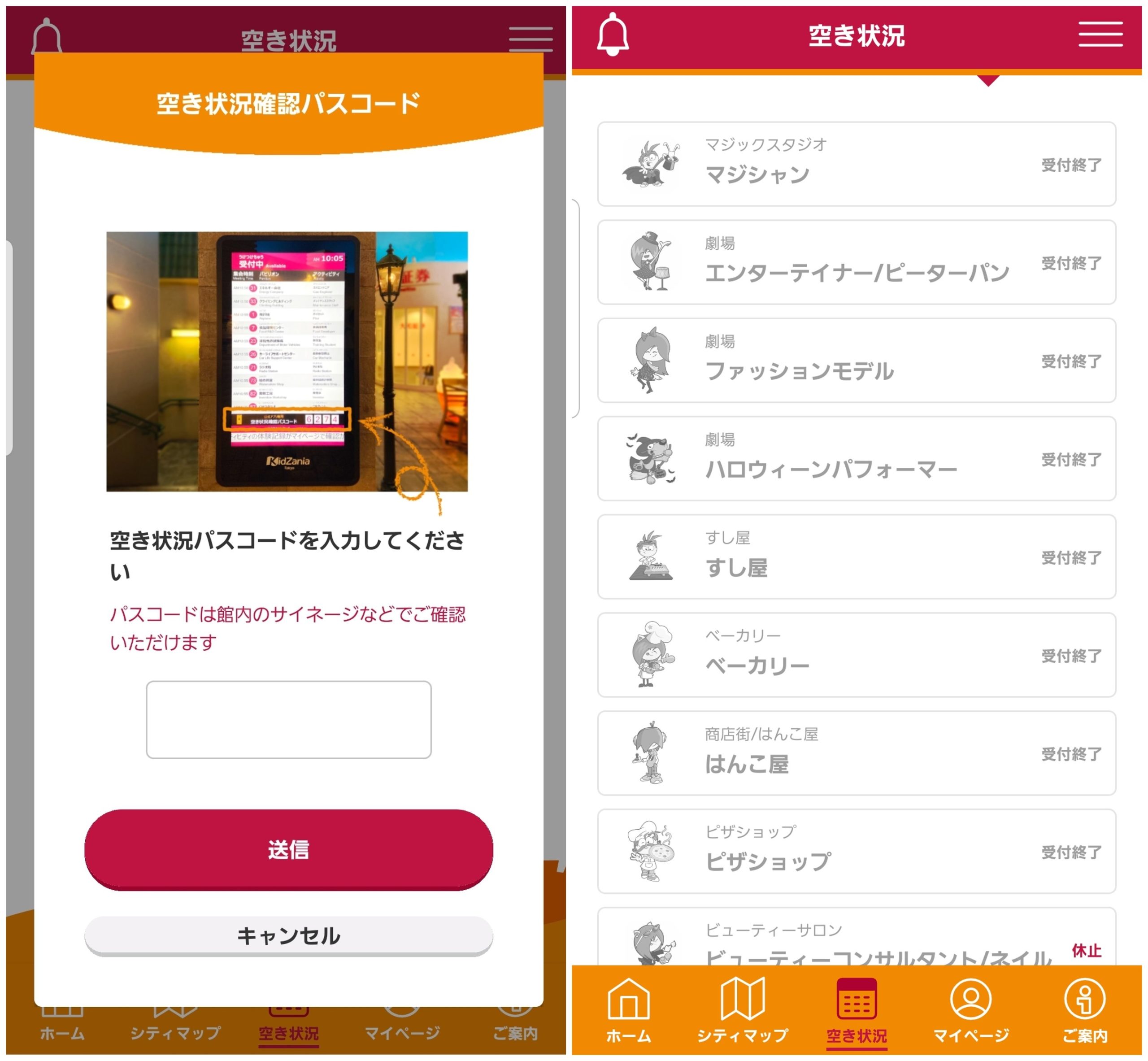 - 会場内にある案内画面でパスコード確認し、そのコードをアプリの「空き状況確認」に入力