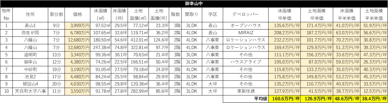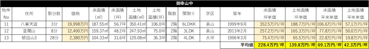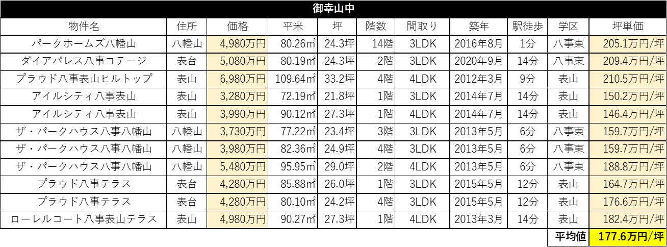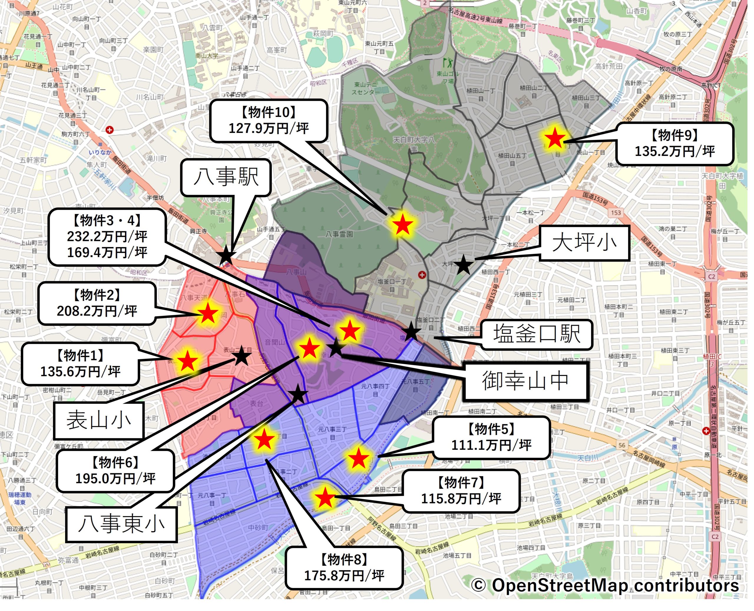 特に今回の表山学区の2件は駅徒歩分数が比較的少なく、希少性の高い立地になっているためかなり高額設定の物件です。