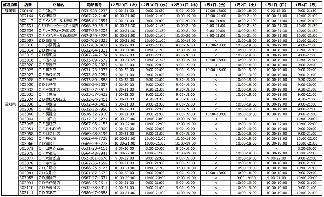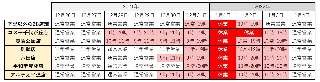 - 多くの店舗で12月31日は9-19時営業、1月2日、3日は10-19時営業
