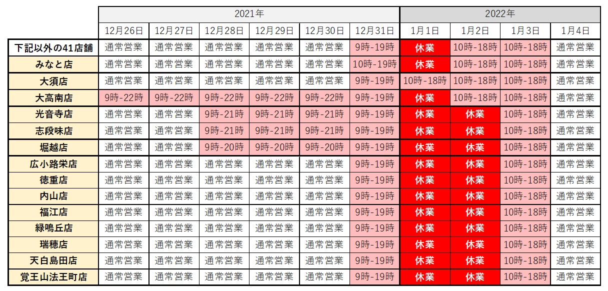 - 営業時間に変更があるのは12月31日と1月3日のみ