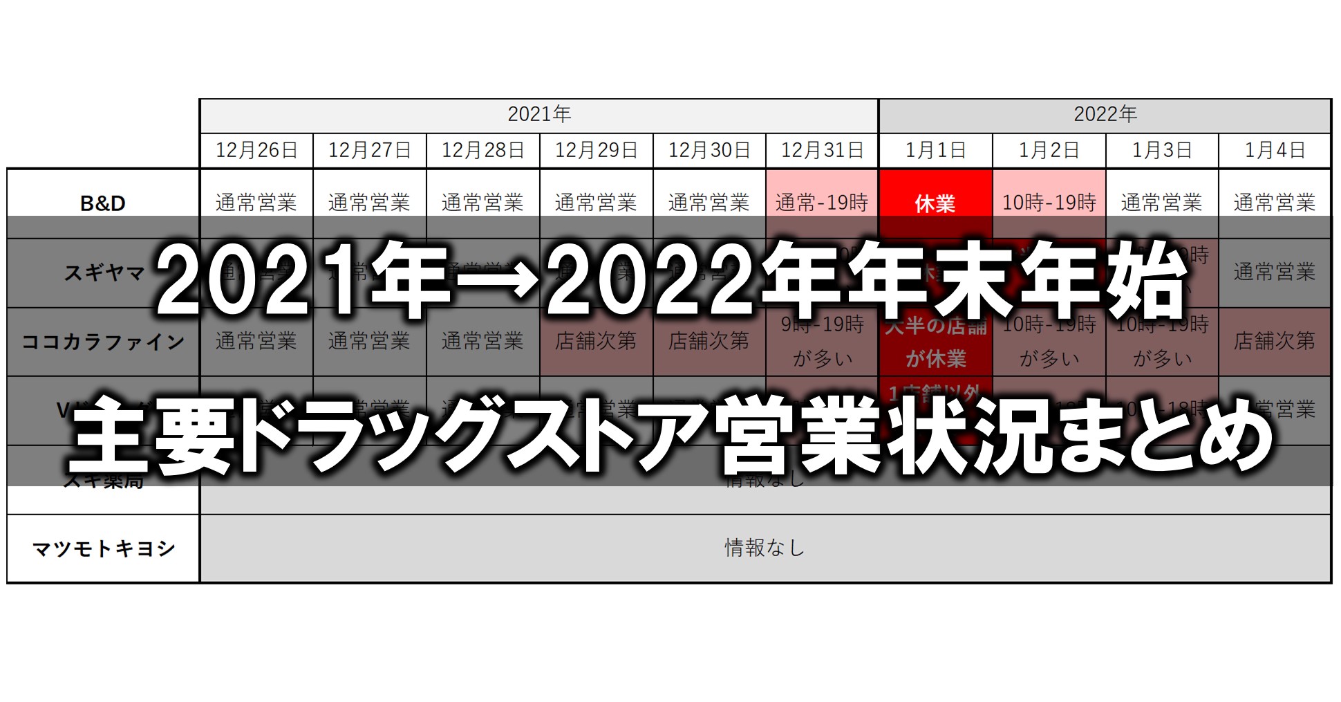 今回は、中部地区にあるVドラッグやスギヤマなどの主要ドラッグストアにおける年末年始の営業に関する情報が揃ってきましたので、2021年から2022年にかけての営業状況まとめを作ってみました。