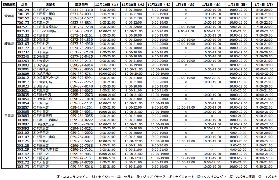 残念ながらスギ薬局とマツモトキヨシは現時点で年末年始の営業情報の掲載がありませんでした。