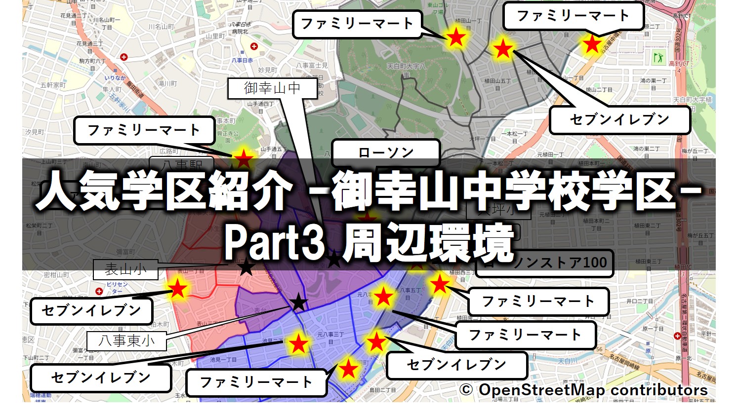 八事東小学区にコンビニが多い印象を持ちますが、他の2学区も充分な数があるので不便ではないと思います。