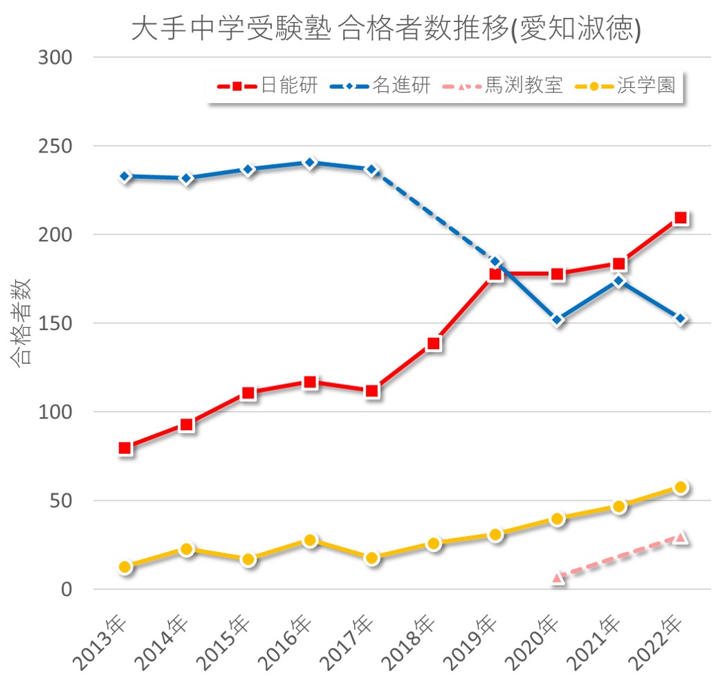 浜・馬渕に関しては合格者数を順調に伸ばしているものの、やはりこの2塾のメインターゲットは東海・南女・滝であることもあってか、伸びは控えめです。