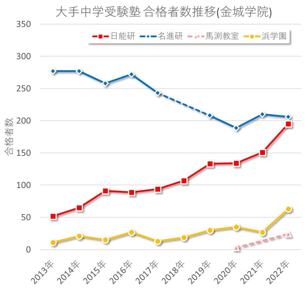 - 金城の合格者数はかなり肉薄しているものの名進研が1位を維持している