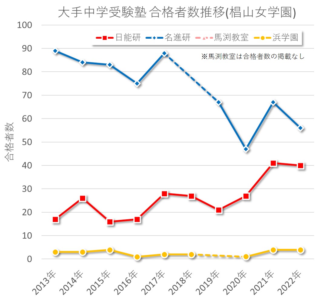 なお、グラフ内にも記載してありますが、椙山女学園については、馬渕教室の合格者数が記載されていなかったため空欄となっております。