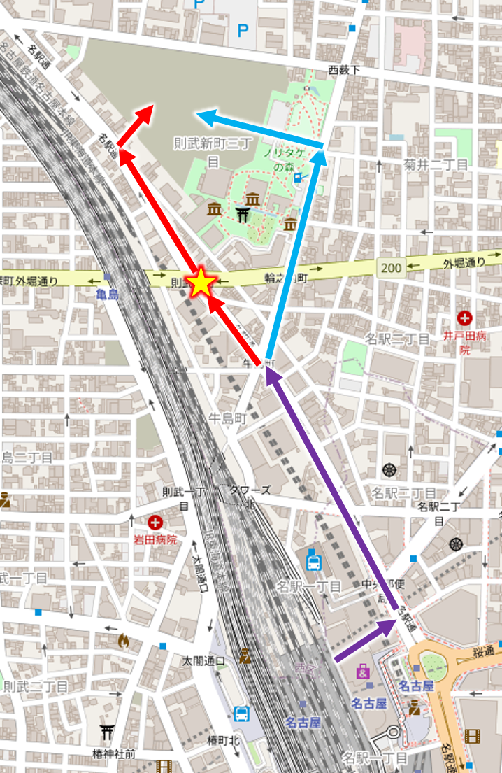 これは、下の図のように、名古屋駅から帰る際のルートでショッピングモールを通らない赤いルートを通ると高確率で通る星印の「則武新町」の交差点に集中しています。