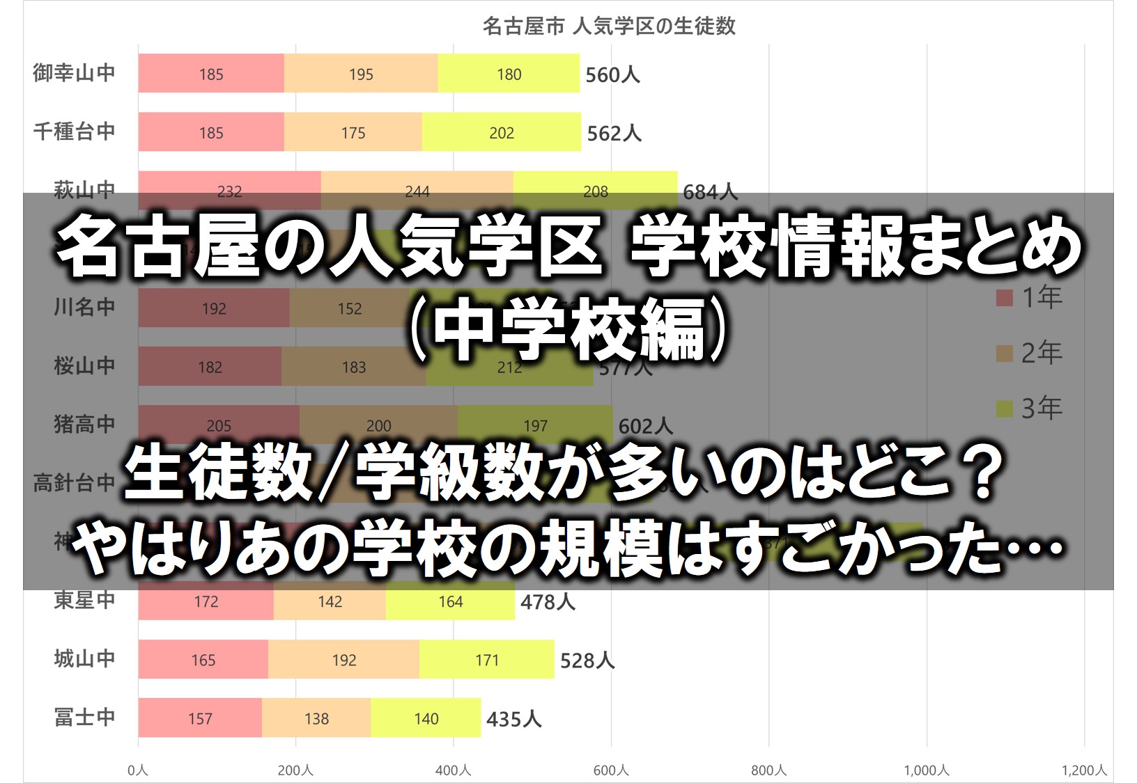 名古屋の人気学区における各中学校の生徒数は以下のようになっています。