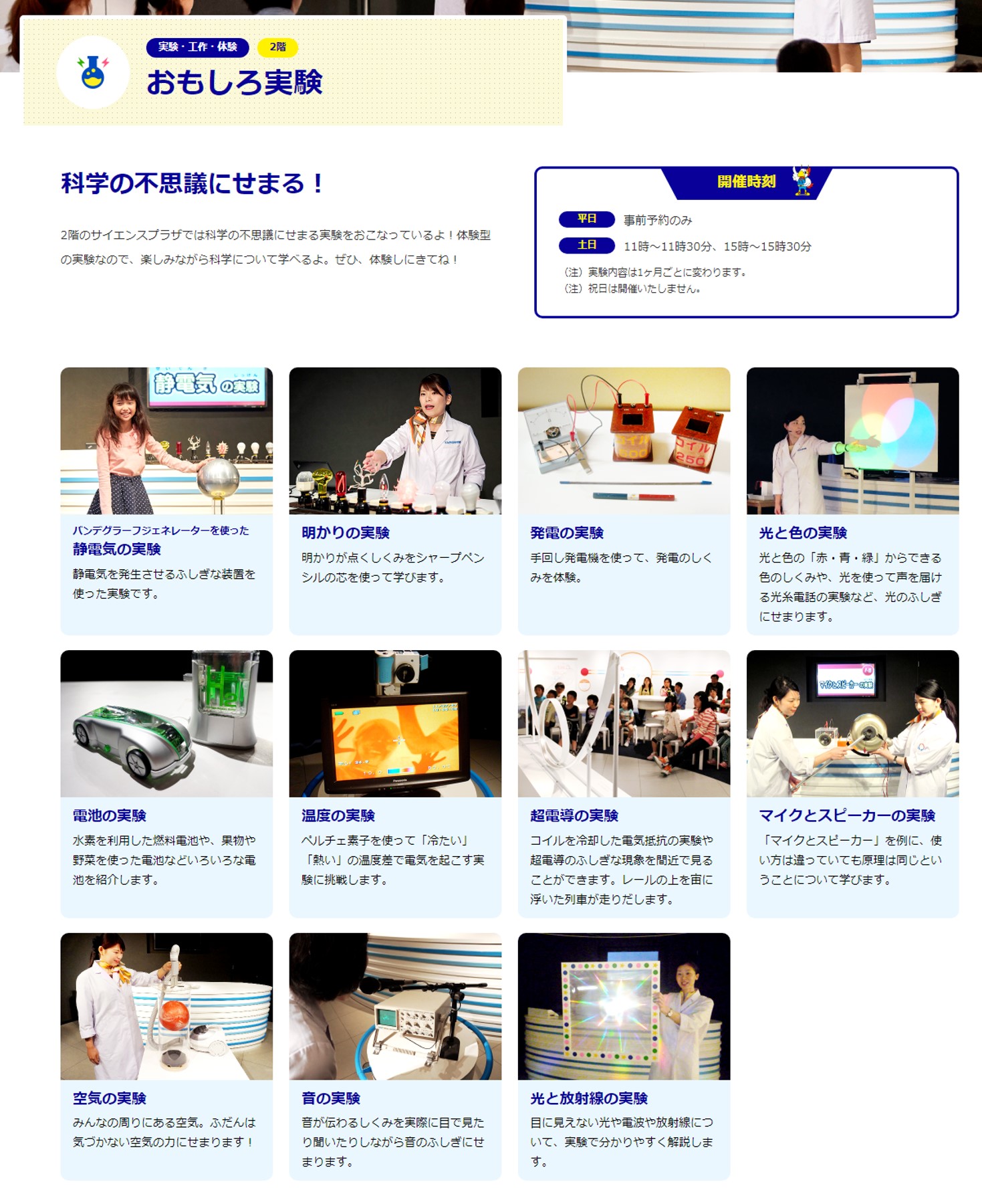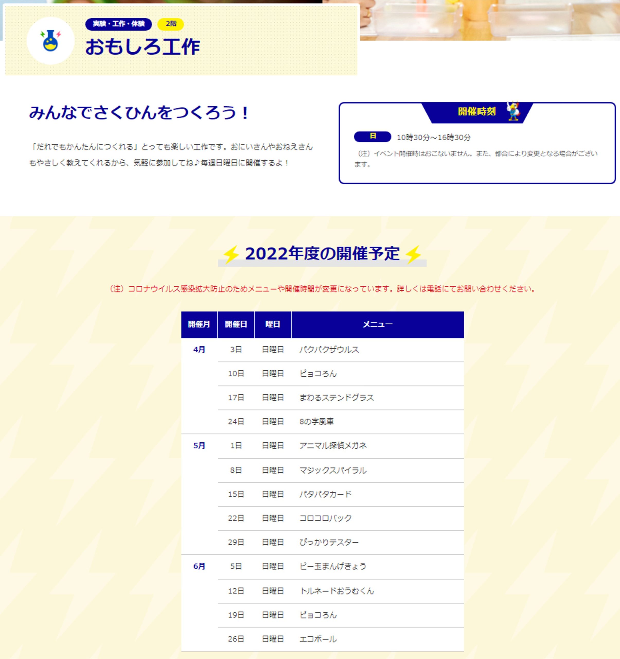 他の実験等は休日は基本的に開催しているものが多いですが、ここのみ日曜日だけ開催になっているので注意が必要です。