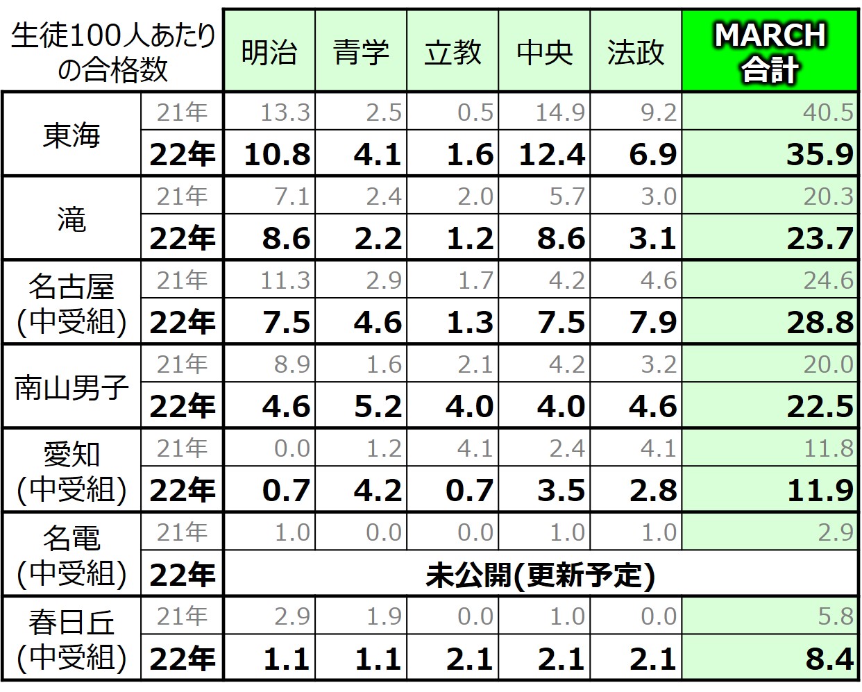- 名古屋中以外の学校は、算出の母数となる生徒数は公表されている実数で再計算を実施