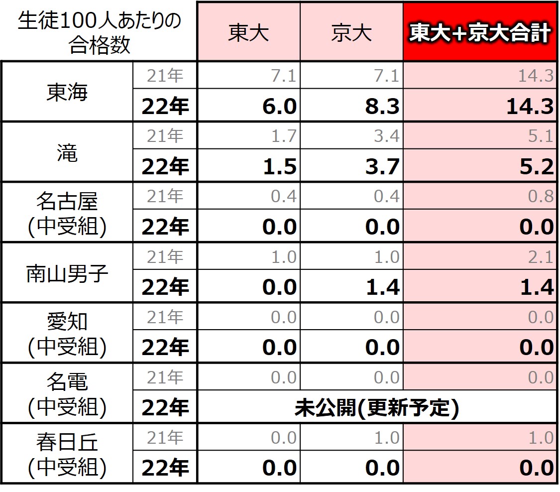 やはり、東大・京大の実績は東海が圧倒的で、2位の滝と比較しても差が大きいです。