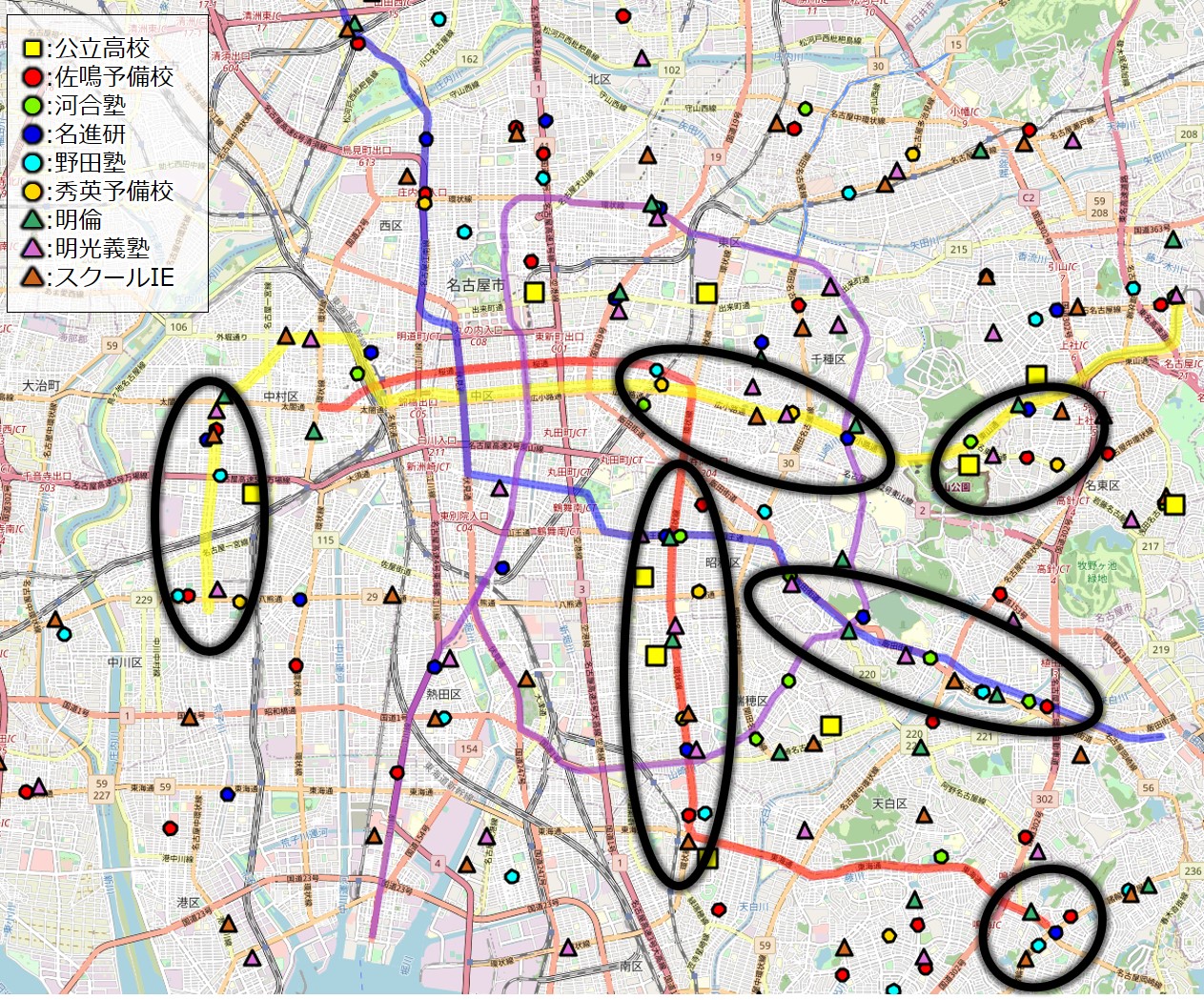 この「河合塾(およびwings)」と「佐鳴予備校」の2塾がある場所をマッピングすると以下のようになりました。