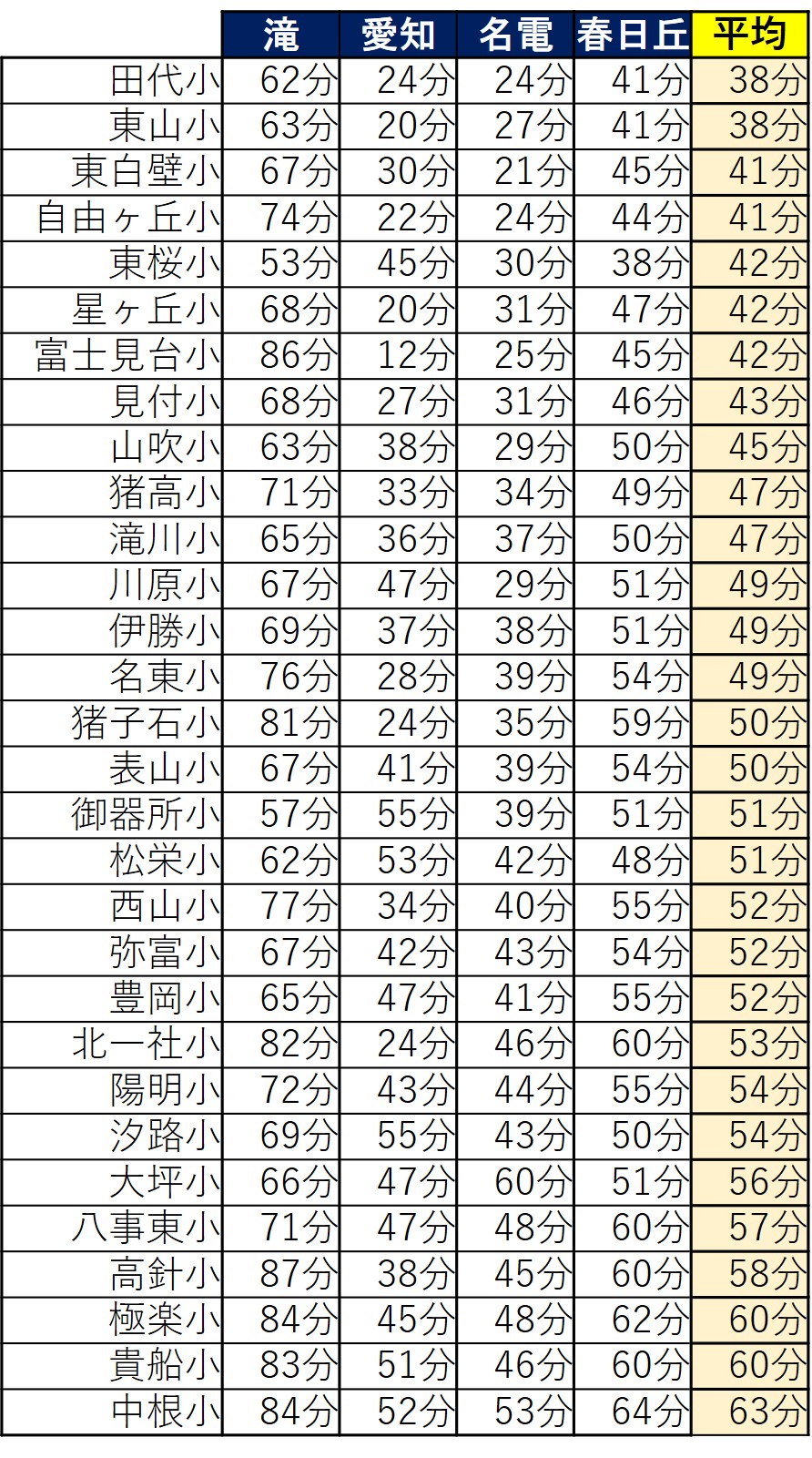 そうなってくると表山小は3位と同等の通学時間(平均33分)となるわけで、イメージが大きく変わるのではないでしょうか。